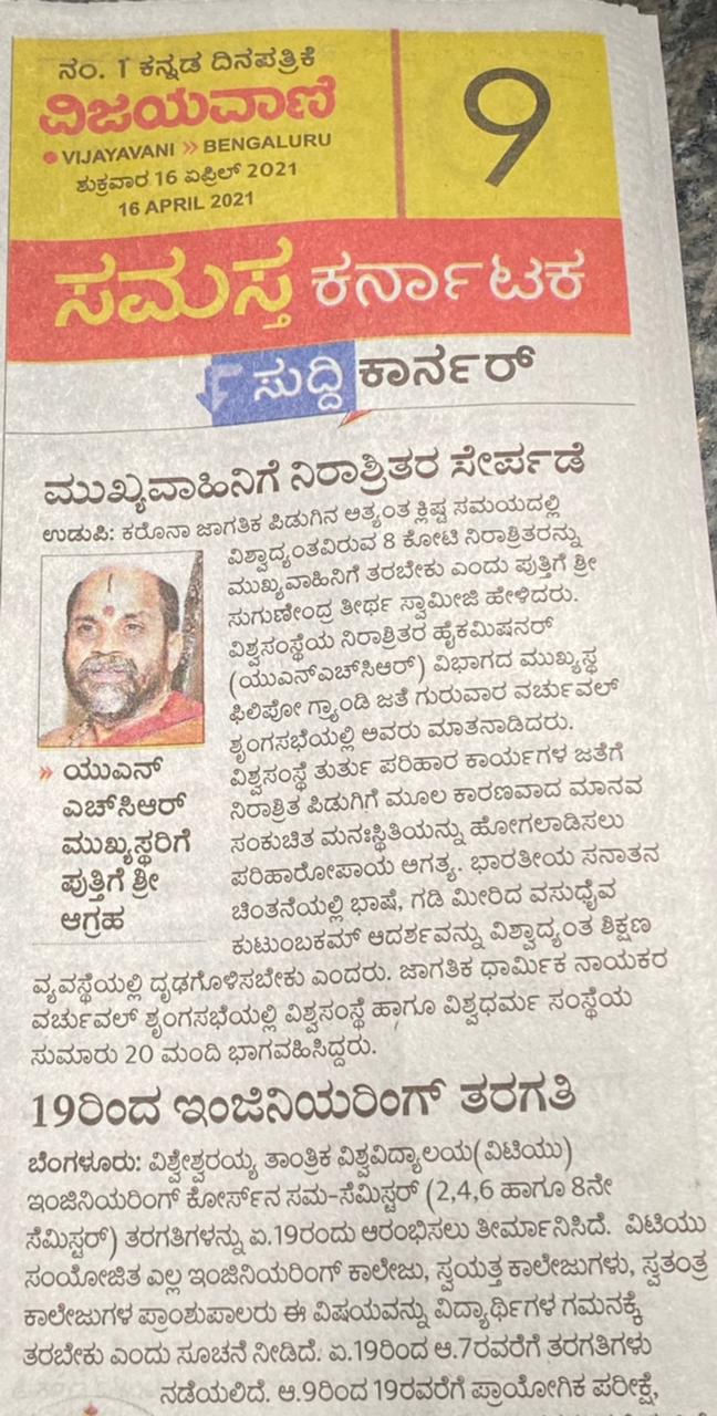 Sri Vishwavallabha Theertha Swamiji of Sode Mutt, in his message from Sode, said the Lord had taught us a lesson in the year that just ended. Corona put all of us in our place, made us humble. In the new Plava samvatsara, the same Lord will help us sail across the ocean of corona in the boat given by Him and attain success in life.