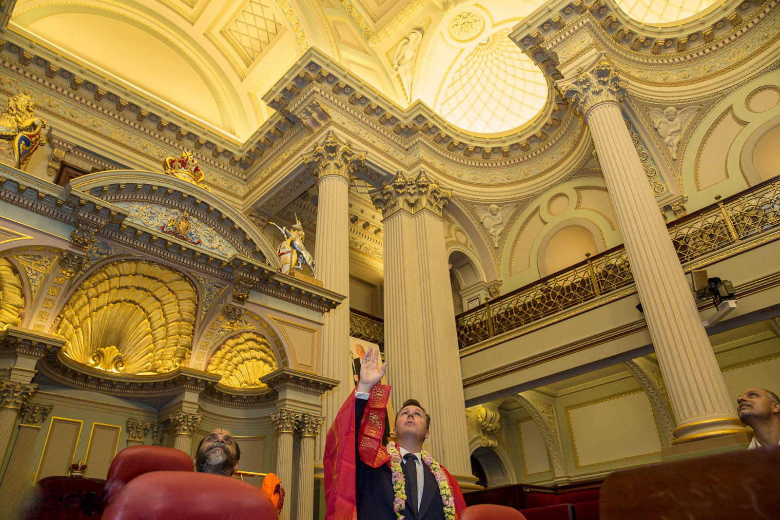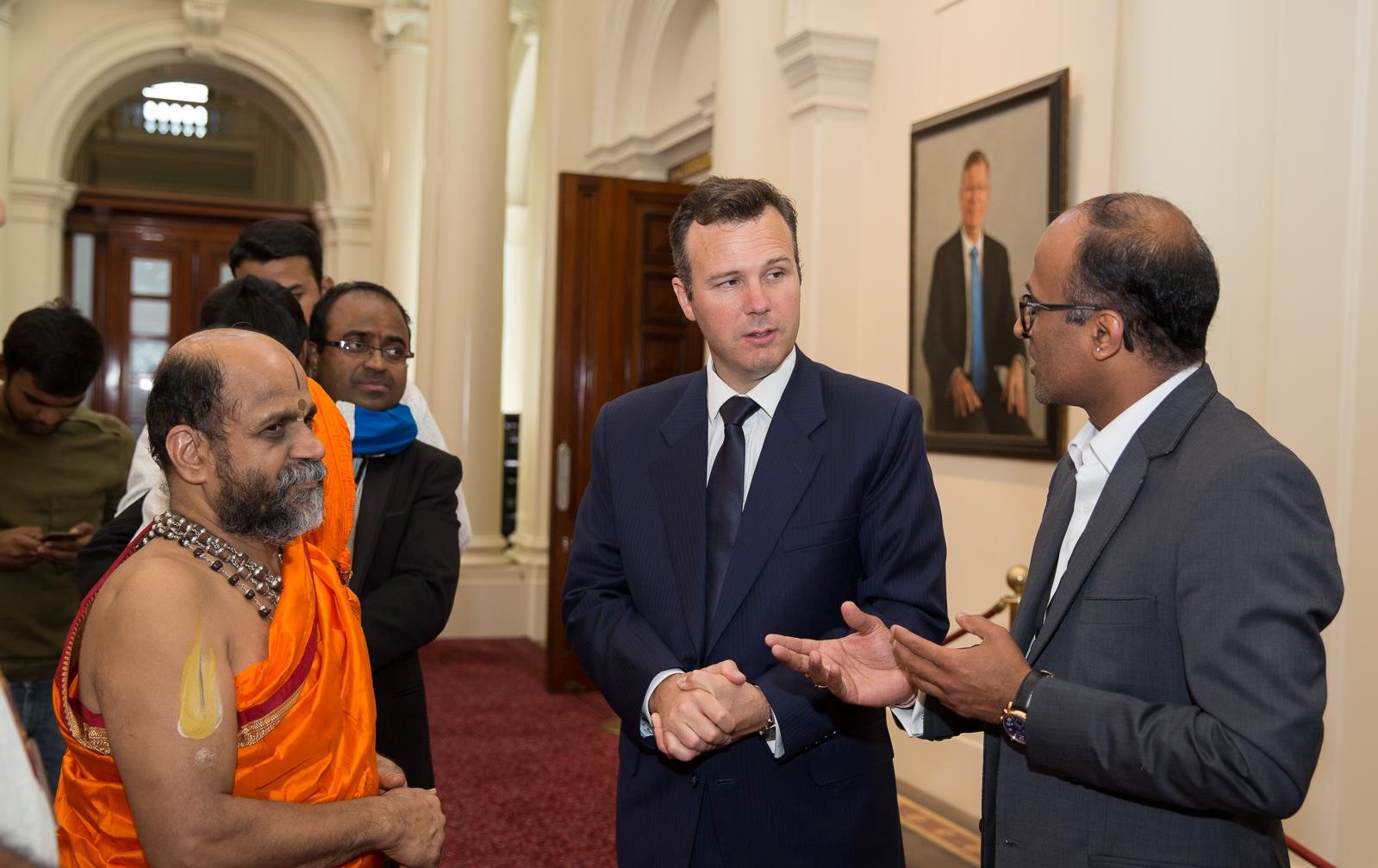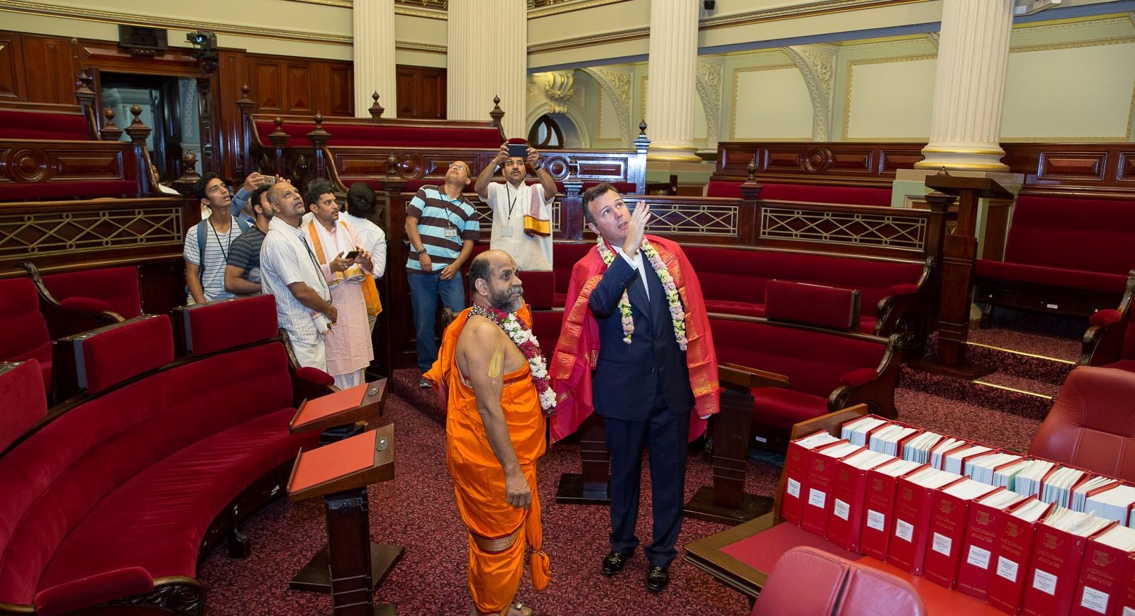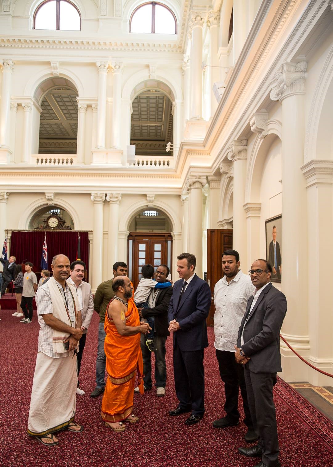 Shri Sugunendra Theertha Swamiji was given official welcome and felicitated at the Parliament of Victoria, Melbourne on 22nd January, 2018. Honorable Michael Gidley, Member of Parliament from Mount Waverley, received Swamiji and group of volunteers and provided a first hand tour of the Parliament House. He was felicitated by the Swamiji and was presented with the photo of Devi Jaganmathe. Honorable Michael Gidley spoke highly of the Swamiji and appreciated his efforts towards World Peace. He also expressed his desire to visit India in the near future to further soak into our culture. He was accorded an invitation to our Temple by the Swamiji.