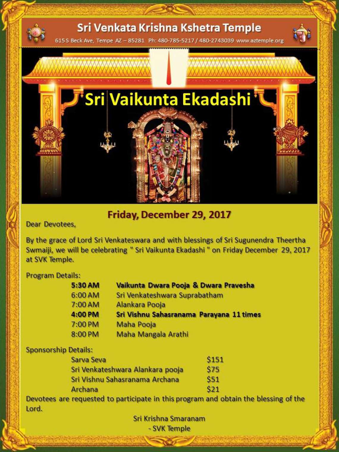 By the grace of Lord Shri Venkateshwara and with the blessings of Shri Sugunendra Theertha Swamiji, we will be celebrating "Shri Vaikunta Ekadashi" on Friday, December 29, 2017 at Shri Venkata Krishna Temple, 615S Beck Ave, Tempe AZ - 85281.