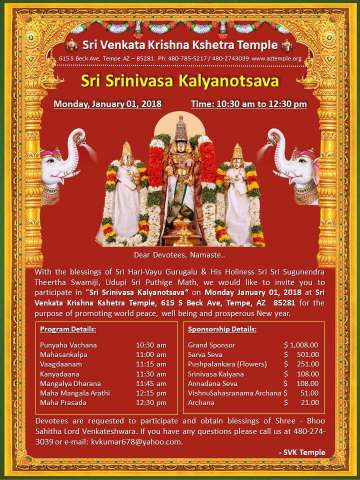 With the blessings of Shri Hari Vayu Gurugalu & His Holiness Shri Shri Sugunendra Theertha Swamiji, Shri Puthige Matha, Udupi, we would like to invite you to participate in "Shri Shrinivasa Kalyanotsava" on Monday, January 01, 2018 at Shri Venkata Krishna Kshetra Temple, 615 S Beck Ave, Tempe, AZ 85281.