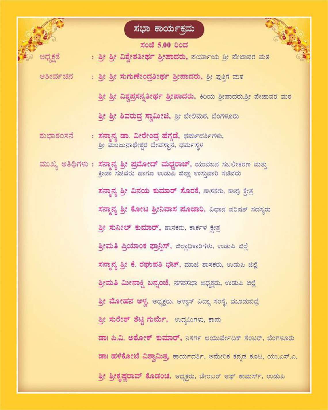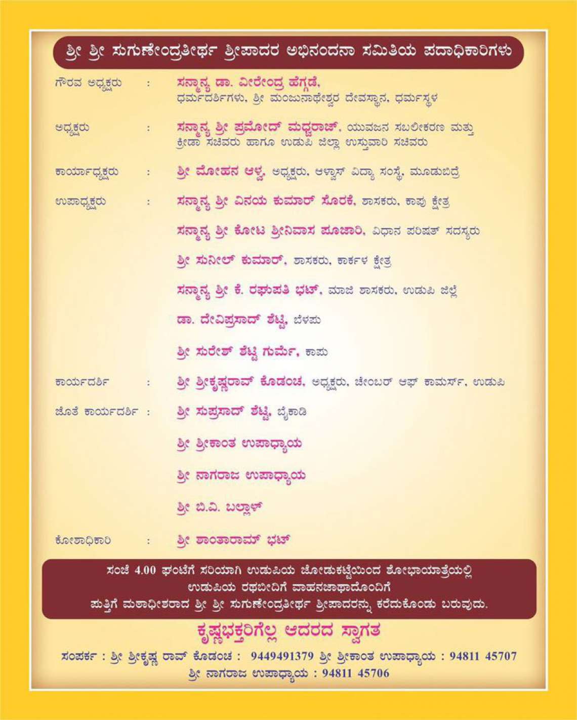 Starting with a parade from Jodukatte to Car Street, Udupi at 4 PM followed by a stage programme to be held at Rajangana, Udupi at 5 PM. All are cordially invited.