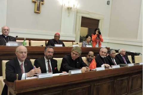 His Holiness Sri Puthige Swamiji along with other religious leaders and dignitaries in the Vatican Summit on Climate Change. (From L to R: Dr. William Vendely, Dr. David Rosen, Rev Olaf Tveit, His Holiness Sri Sri Sugunendraa Theertha Swamiji, Metropolitan Emanuel and Din Samsuddin