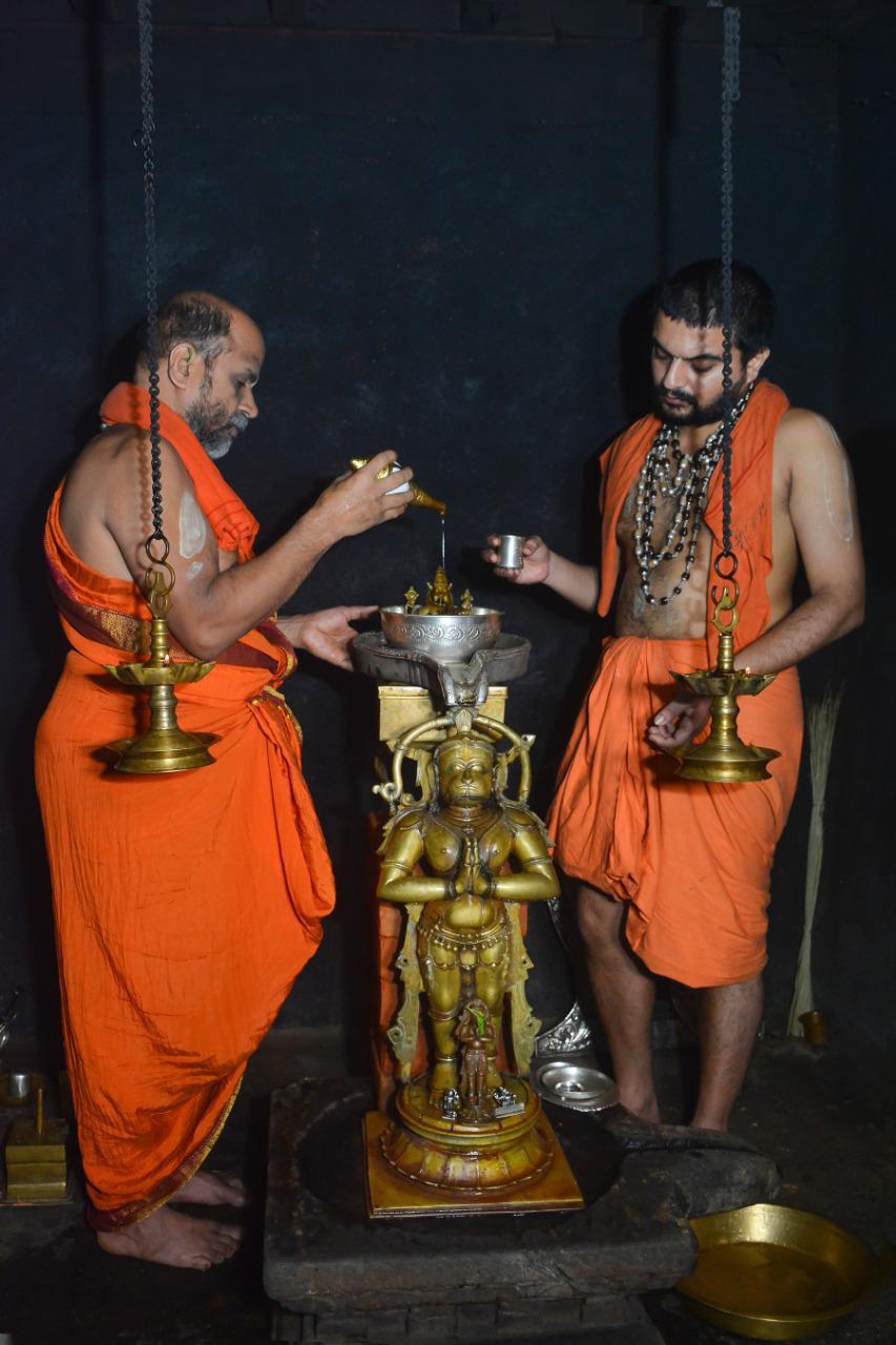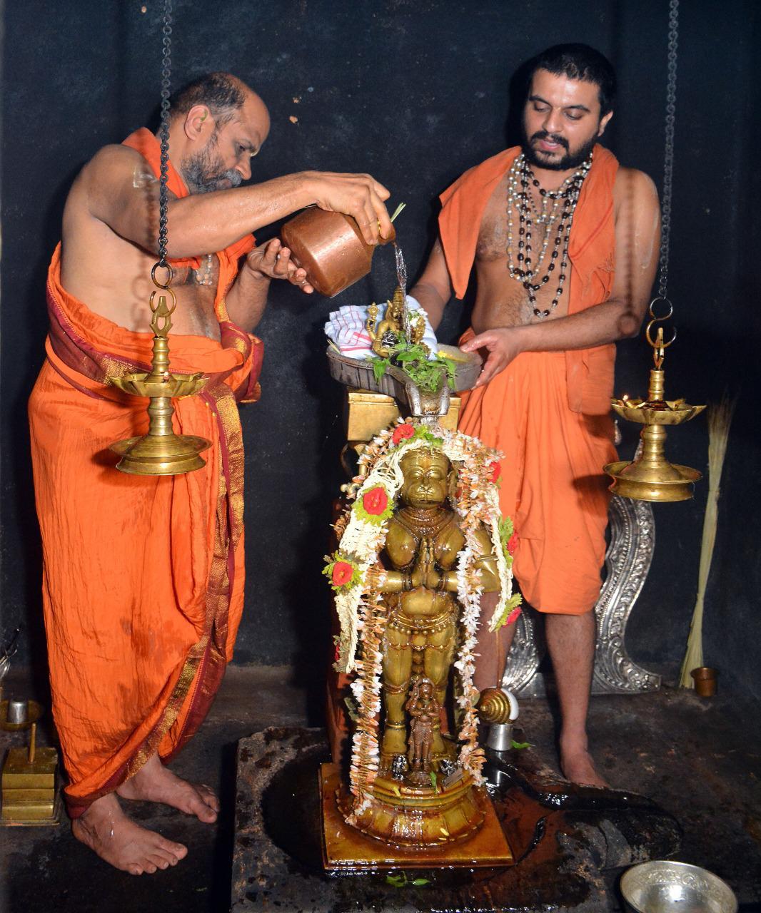 On the auspicious occasion of Hanumantha Jayanthi Sri Sugunendra Theertha Swamiji and Sri Sushreendra Theertha Swamiji performed the divine Madhu Abhisheka