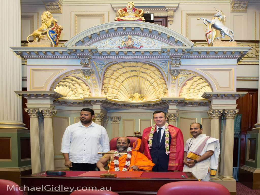 Shri Sugunendra Theertha Swamiji was given official welcome and felicitated at the Parliament of Victoria, Melbourne on 22nd January, 2018. Honorable Michael Gidley, Member of Parliament from Mount Waverley, received Swamiji and group of volunteers and provided a first hand tour of the Parliament House. He was felicitated by the Swamiji and was presented with the photo of Devi Jaganmathe. Honorable Michael Gidley spoke highly of the Swamiji and appreciated his efforts towards World Peace. He also expressed his desire to visit India in the near future to further soak into our culture. He was accorded an invitation to our Temple by the Swamiji.